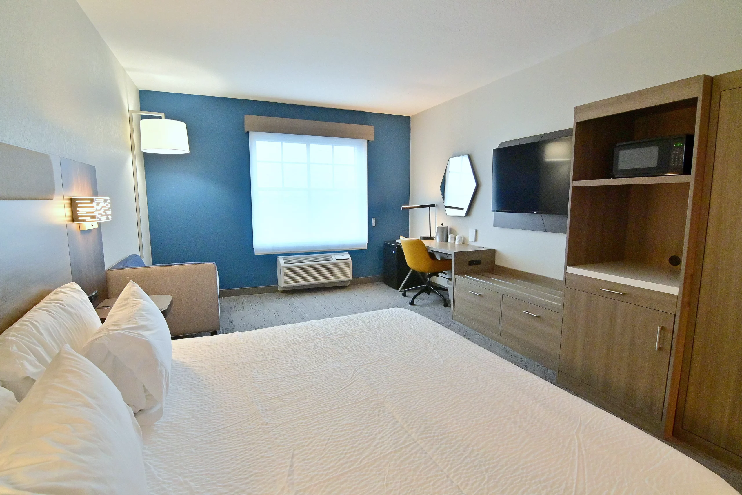 Conversion from a Days Inn Hotel to a Holiday Inn Express & Suites. Fully reimagining exterior, new landscaping. Reconfigured public space to meet the Holiday Inn Express brand standards. Renovated fitness center, and new sundry shop. Newly renovated guestrooms and bathrooms.